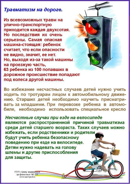 Из всевозможных травм на улично-транспортную приходится каждая двухсотая. Но последствия их очень серьезны. Самая опасная машина-стоящая: ребенок считает, что если опасности не видно, значит, ее нет. Но, выходя из-за такой машины на проезжую часть, 63 ребенка из 100 попавших в дорожное происшествие попадают под колеса другой машины.