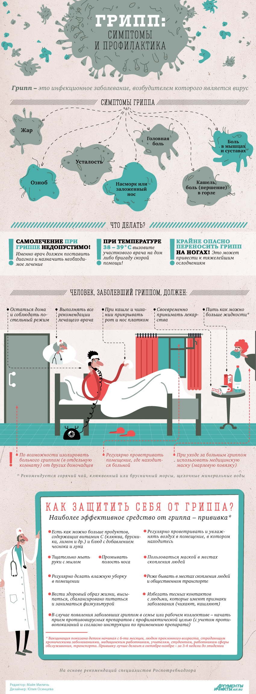 Самолечение при гриппе недопустимо, и именно врач должен поставить диагноз и назначить необходимое лечение, соответствующее состоянию и возрасту пациента.