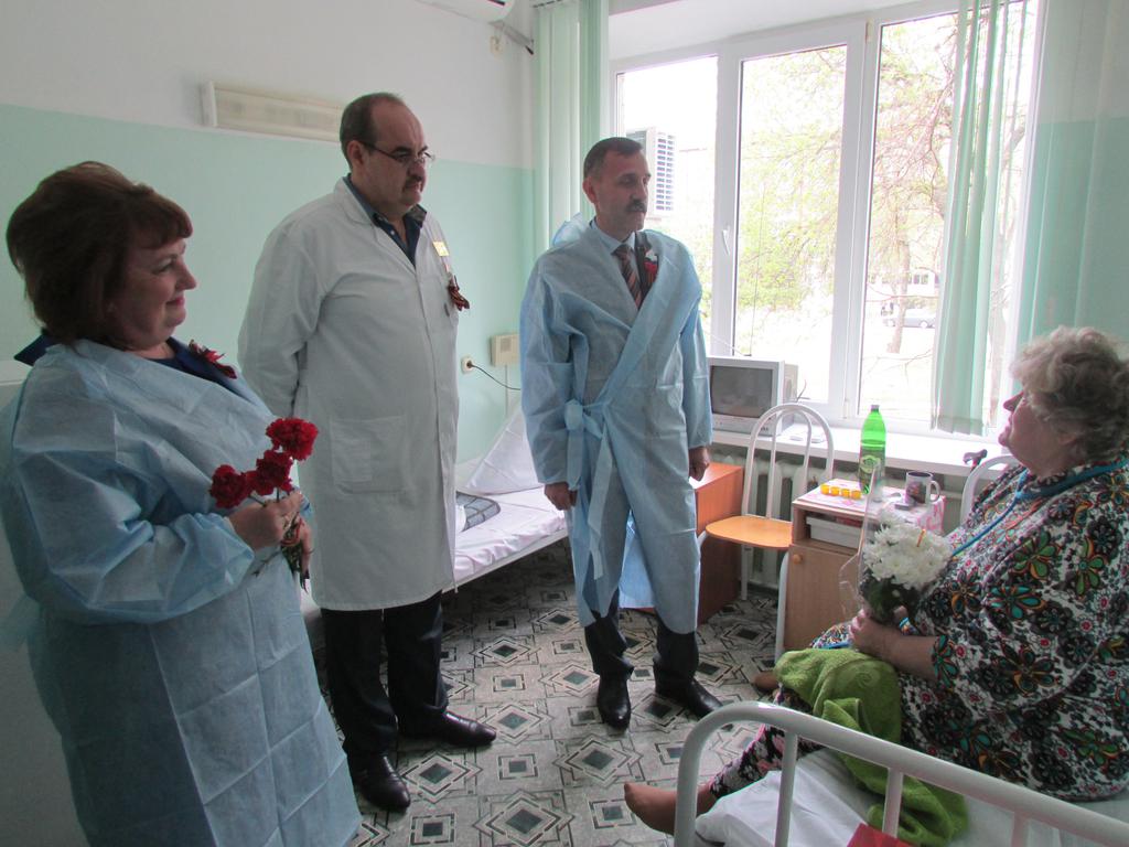 В канун 70-летия Победы в Великой Отечественной войне глава муниципального образования Ейский район М.Н.Тимофеев, заместитель главы муниципального образования Ейский район по социальным вопросам Т.В.Таран и главный врач МБУЗ МО Ейский район «ЦРБ» С.Г.Сланский сердечно поздравили с самым главным и почитаемым праздником в нашей стране ветеранов Великой Отечественной войны и приравненных к ним граждан, находящихся на лечении в стационаре МБУЗ МО Ейский район «ЦРБ».