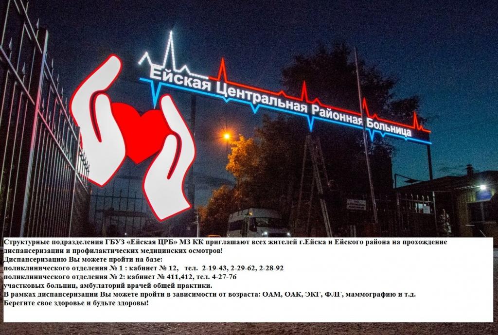 ГБУЗ "Ейская ЦРБ" МЗ КК приглашает всех жителей г. Ейская и Ейского района на прохождение диспансеризации и профилактических осмотров!